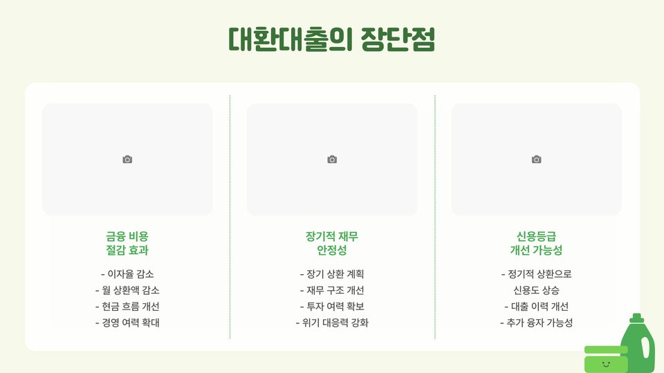 또한, 대출 신청 전에는 반드시 여러 금융기관의 조건을 비교하고, 자신의 상황에 맞는 대출 상품을 선택해야 합니다. 재정적 부담을 줄이고 안정적인 사업 운영을 위해서는 대환대출의 활용이 필수적입니다.