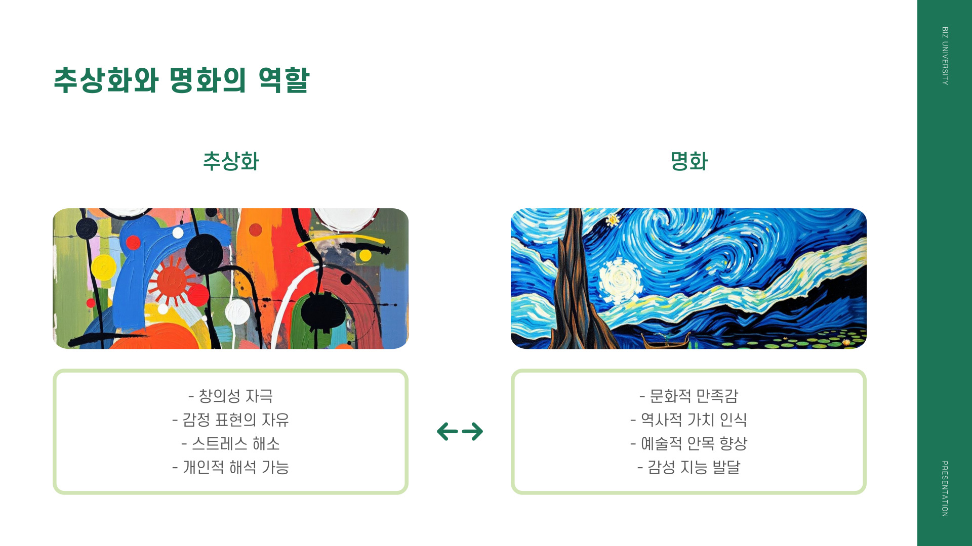 스트레스를 해소하는데 효과적인 그림은 자연 풍경, 동물 그림, 그리고 추상 미술 등이 있습니다. 이러한 요소들은 우리의 시각적 피로를 덜어주고, 편안한 마음을 불러일으킵니다. 특히, 푸른색과 초록색 계열의 그림은 심리적으로 안정감을 주는 색상으로 알려져 있습니다.