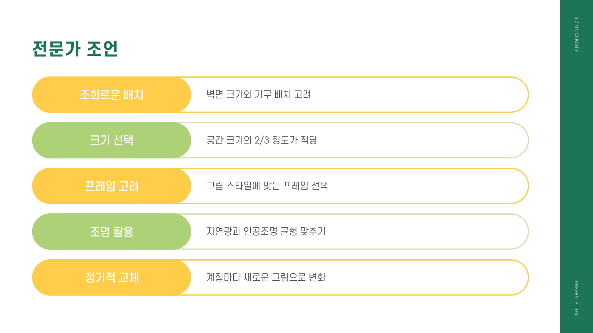 그림 선택은 단순히 예술 작품을 고르는 것에 그치지 않습니다. 어떤 그림이 내 거실에 어울릴지 고민하는 과정은 자기 자신을 돌아보는 기회가 되기도 합니다. 그림이 가지는 색감, 형태, 그리고 주제는 각각의 사람들에게 다양한 감정을 불러일으킵니다. 추상화, 자연, 인물화 등 다양한 주제 중에서 자신과 가장 잘 맞는 것을 선택하는 것이 중요합니다.