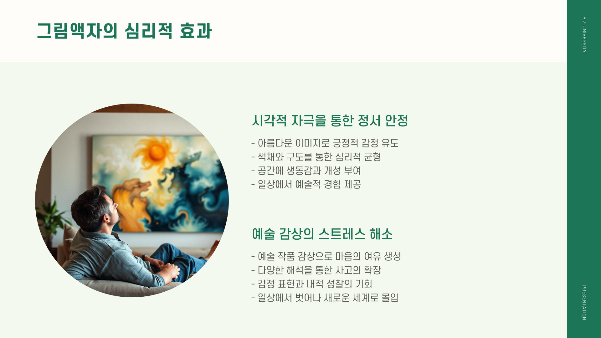 거실그림액자는 단순한 장식 요소를 넘어서 심리적인 영향을 미치는 요소로 작용할 수 있습니다. 연구에 따르면, 아름다운 그림은 스트레스를 줄이는 데 도움이 되며, 심리적으로 긍정적인 감정을 유도합니다. 이는 특히 자연의 풍경, 밝고 따뜻한 색상의 이미지일 때 그 효과가 더욱 두드러집니다. 또한, 그림의 주제와 개인의 취향이 잘 맞을 때, 그 효과는 극대화됩니다.