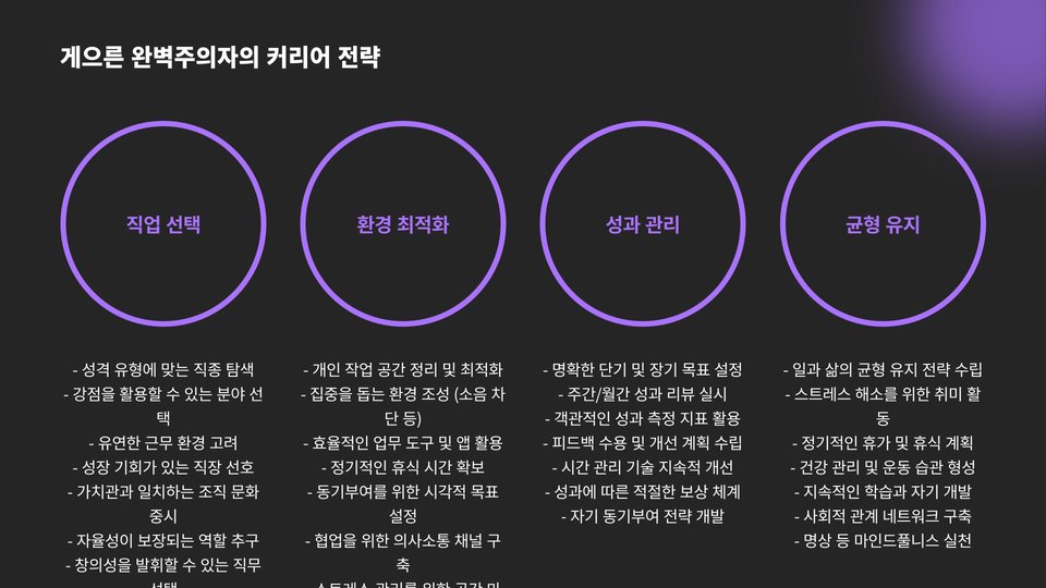 게으른 완벽주의자 MBTI 전문가들은 자신의 강점을 잘 활용하는 동시에, 게으름이라는 특징을 인지하고 이를 극복하기 위한 전략적인 행동을 취합니다. 그들의 성공 비결은 단순히 근면함에 그치지 않고, 효율적인 작업 방식과 자기 이해에 기초한 것입니다. 이들은 자신의 방식으로 성공을 이끌어내며, 지혜로운 선택의 중요성을 보여줍니다.