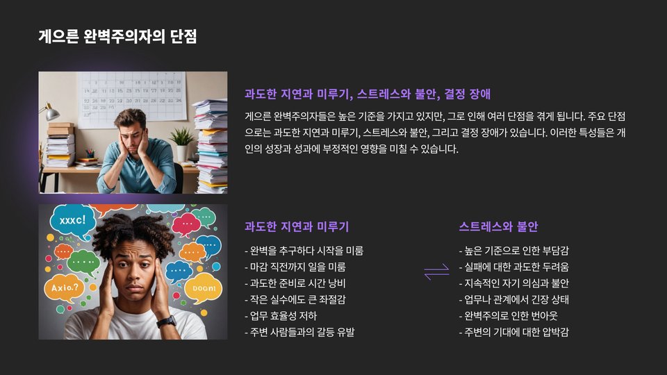 또한, 그들은 자신의 능력에 대해 의심을 가지는 경우가 많습니다. 자기비판이 심하여 작은 실패에도 큰 스트레스를 느끼곤 합니다. 이러한 성향은 그들이 행동하기 전에 너무 많은 생각을 하게 만들고, 결국에는 완벽한 결과물을 얻기 위해 행동을 주저하게 만듭니다. 이렇듯 게으른 완벽주의자는 목표를 달성하는 데 있어 장애물이 많습니다.