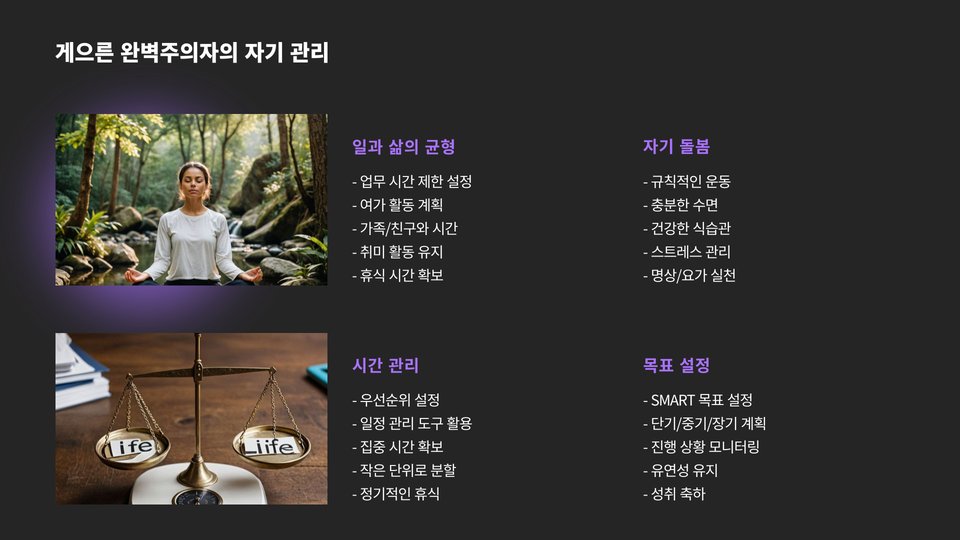 둘째, 긍정적인 피드백을 스스로에게 주는 것이 중요합니다. 작은 성공을 축하하고, 이를 통해 자신감을 얻는 것이 필요합니다. 이는 자기비판을 줄이고, 앞으로 나아갈 수 있는 힘을 줍니다. 자기 격려는 게으른 완벽주의자에게 큰 도움이 됩니다.