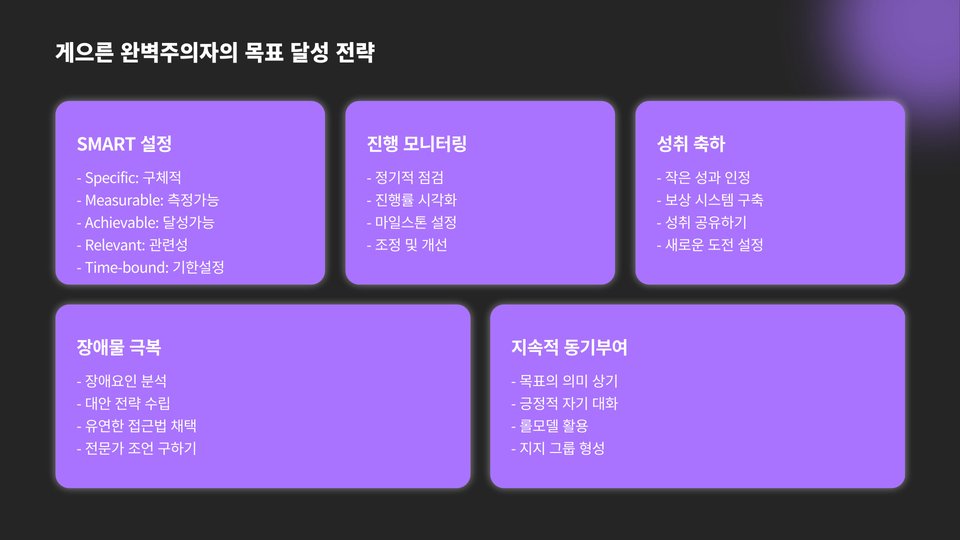 그렇다면 게으른 완벽주의자가 어떻게 성공할 수 있을까요? 그들의 성공 비결은 다음과 같은 몇 가지 전략에 기반합니다. 첫째, 목표를 세분화하는 것입니다. 작은 목표로 나누면 부담이 줄어들고, 초기의 행동을 촉진할 수 있습니다.