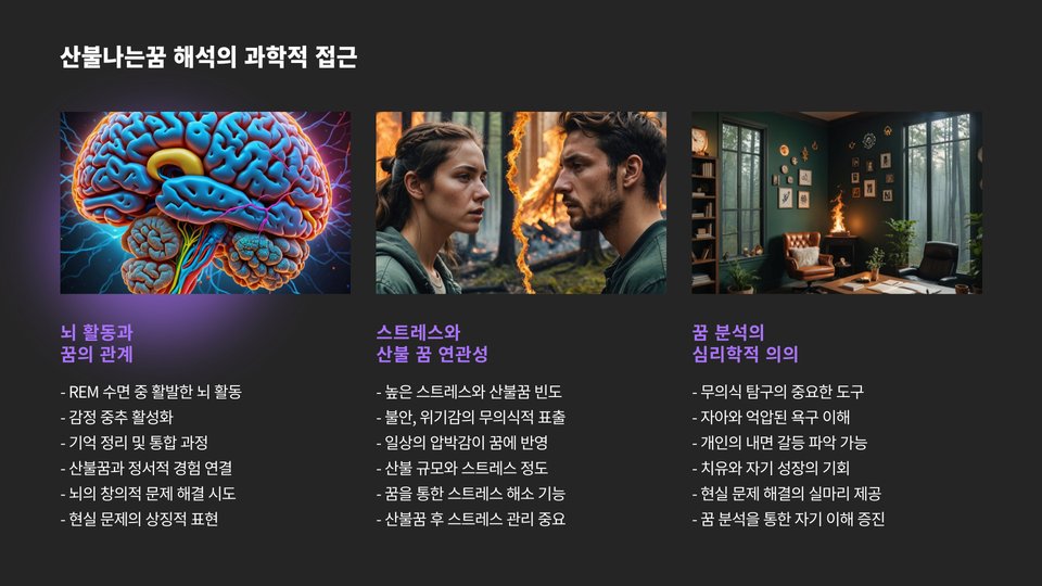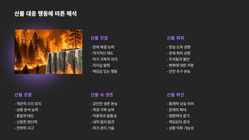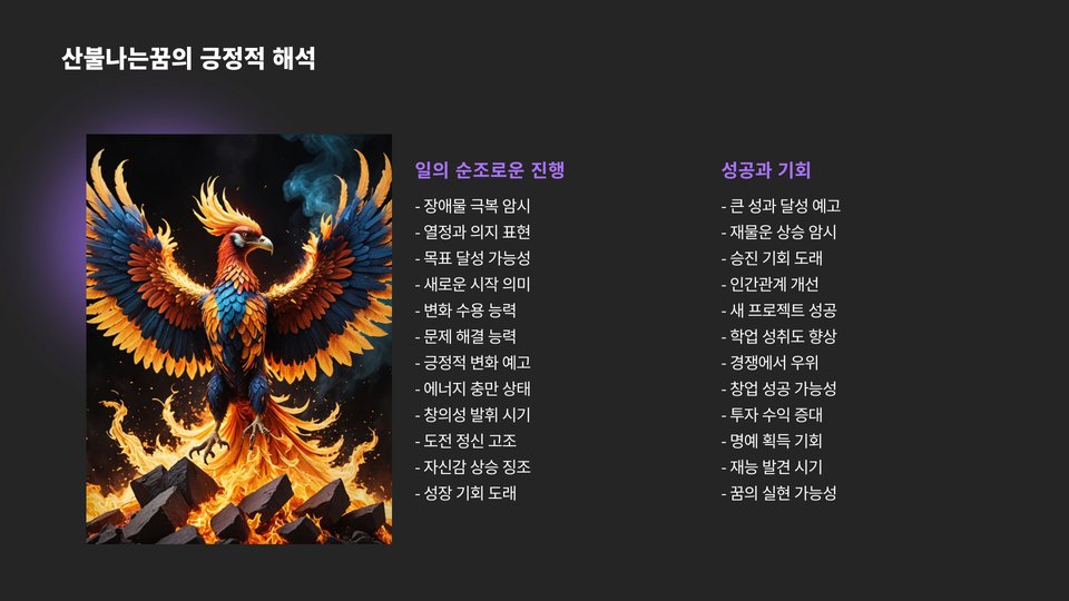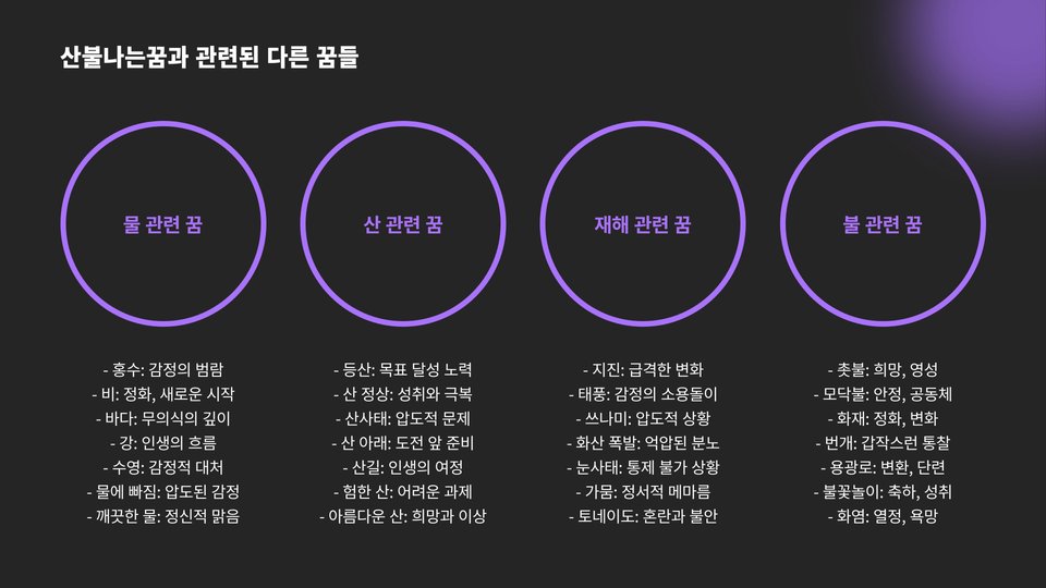 이제 산불나는꿈의 다양한 해석을 살펴보겠습니다. 각각의 해석은 개인의 상황이나 맥락에 따라 달라질 수 있으므로, 자신의 경험과 감정을 바탕으로 해석해 보세요.