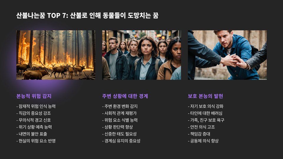 이와 같은 방식으로 계속해서 산불나는 꿈을 분석해 나갈 수 있습니다. 각 꿈에서 드러나는 메시지를 이해하고 삶에 적용하는 것이 중요합니다. 꿈을 통해 전달받는 메시지는 우리의 삶에 직접적인 영향을 줄 수 있으며, 이를 통해 더 나은 결정을 내릴 수 있습니다.