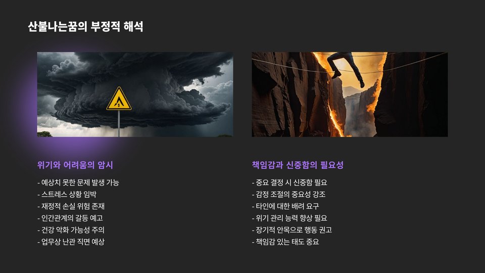 마지막으로, 꿈의 맥락과 개인의 상황에 따라 산불나는 꿈은 서로 다른 의미를 가질 수 있습니다. 꿈의 주인공이 누구인지, 그리고 그 꿈이 나타나는 순간의 감정이 무엇인지에 따라 해석은 다양합니다. 꿈의 배경, 즉 장소와 사람들도 중요한 요소입니다.