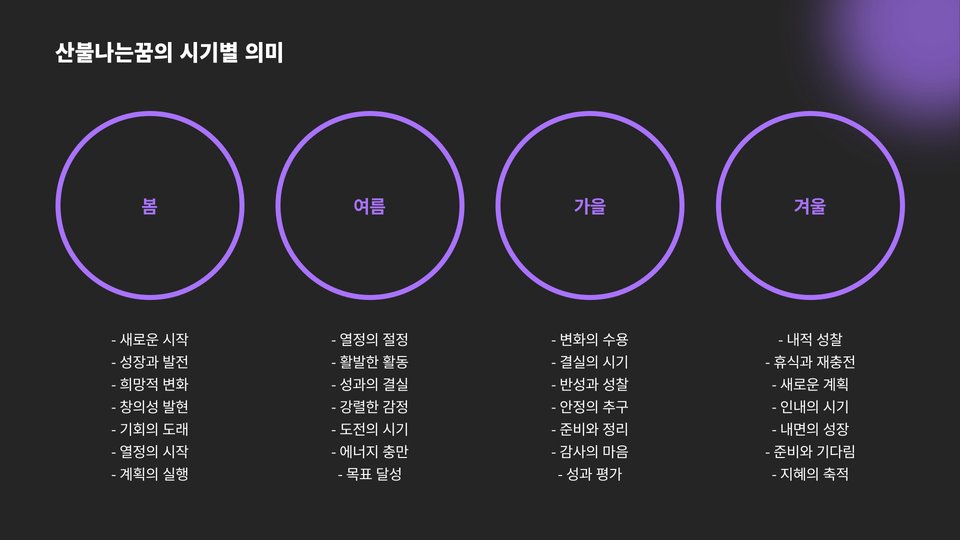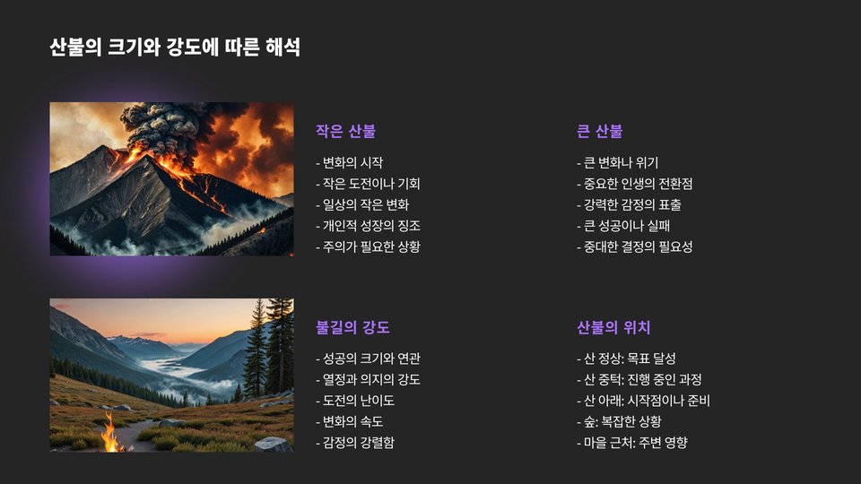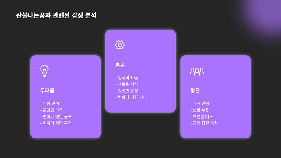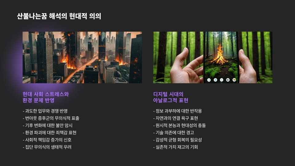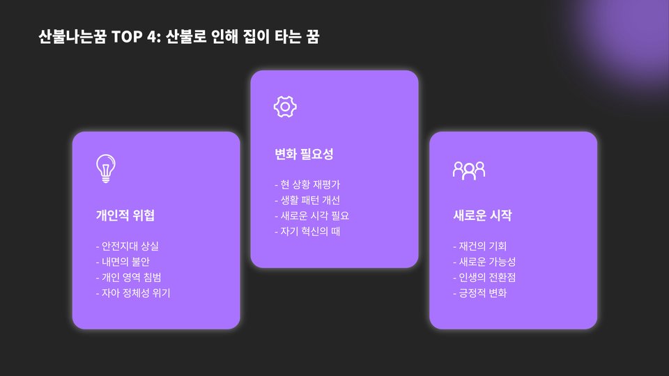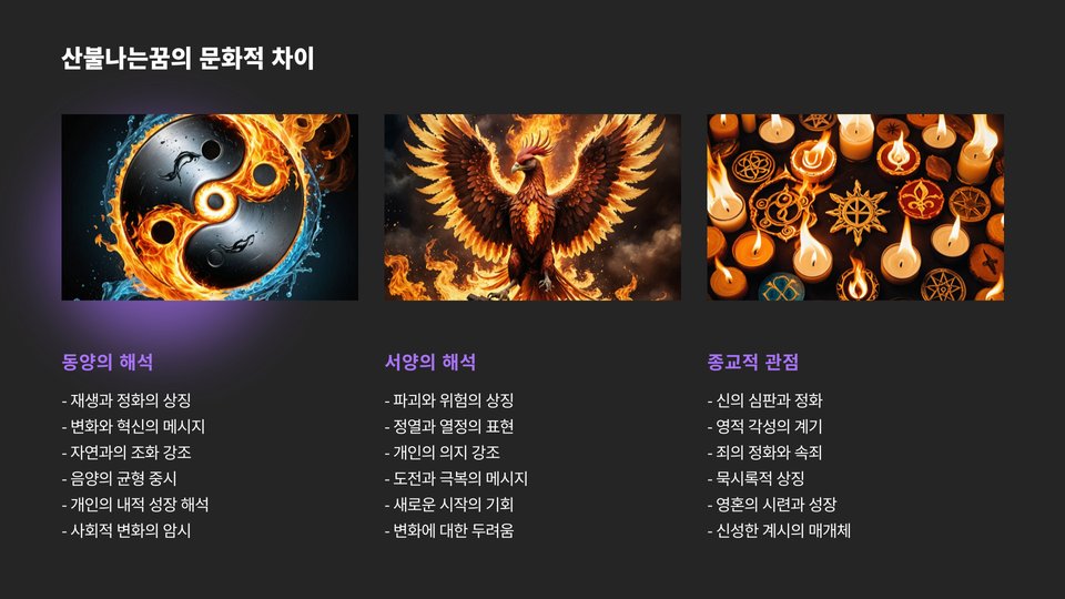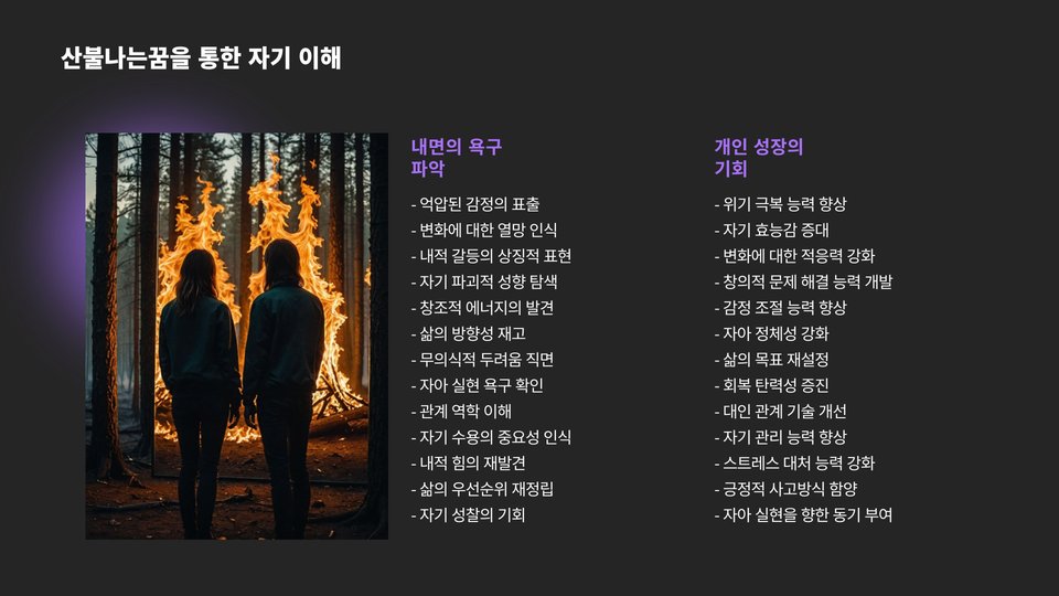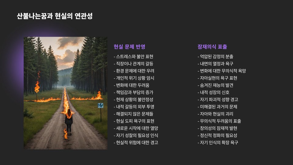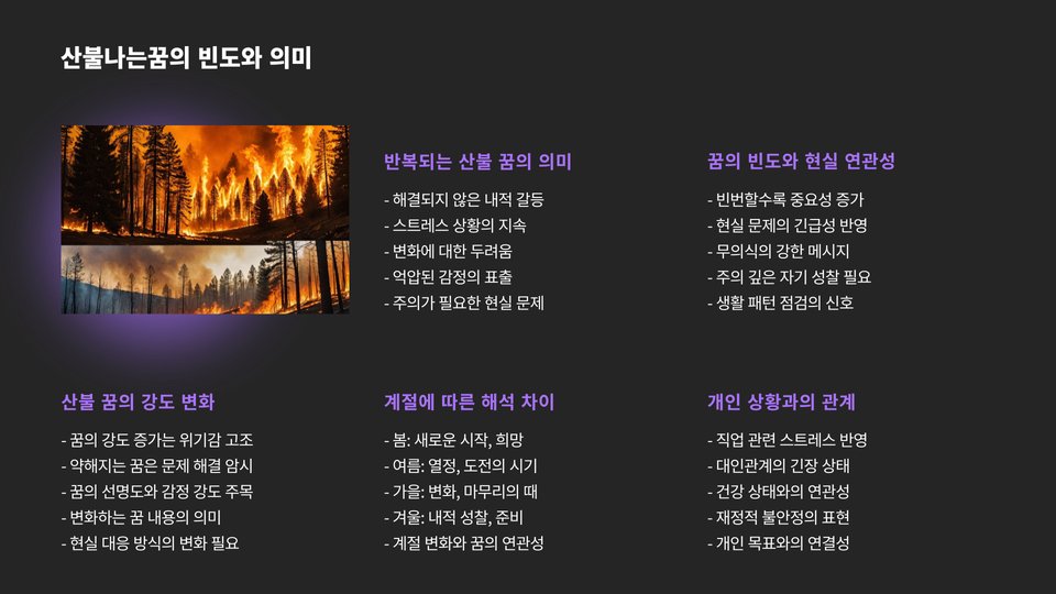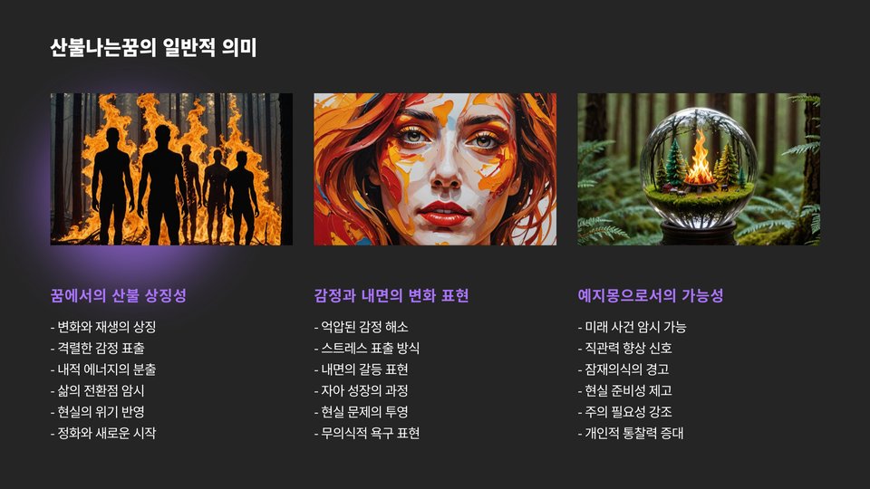 이제 산불나는꿈의 다양한 해석을 살펴보겠습니다. 각각의 해석은 개인의 상황이나 맥락에 따라 달라질 수 있으므로, 자신의 경험과 감정을 바탕으로 해석해 보세요.
