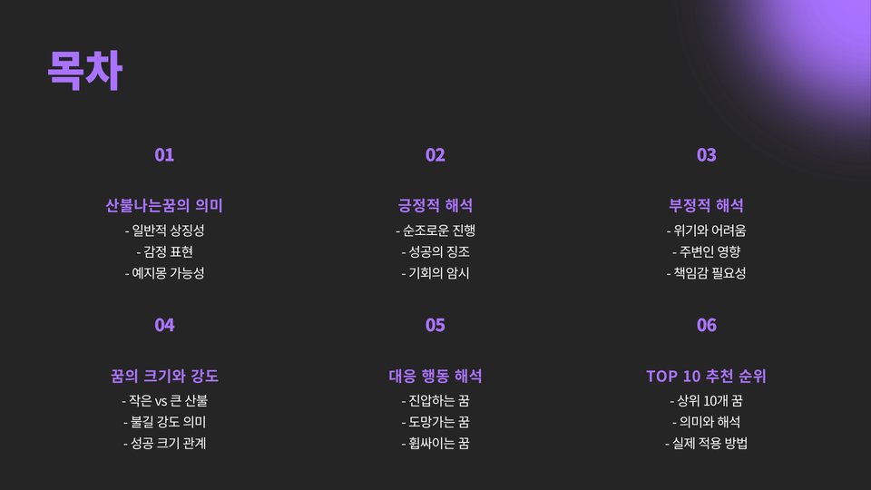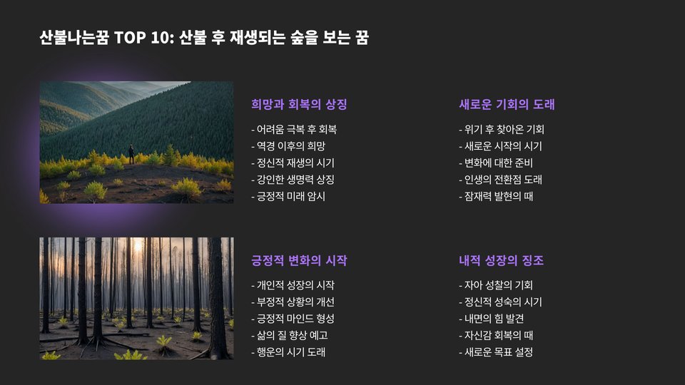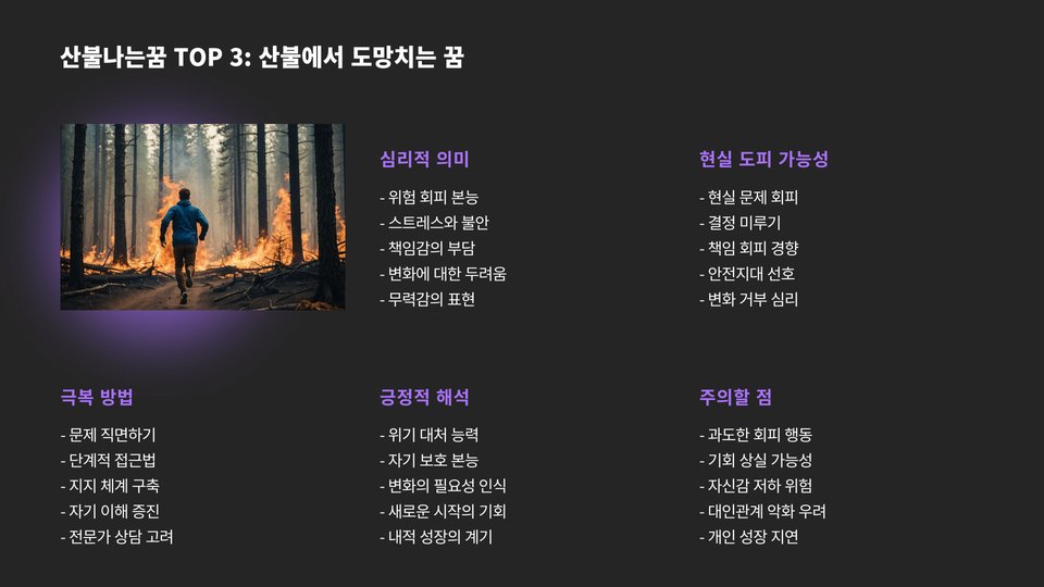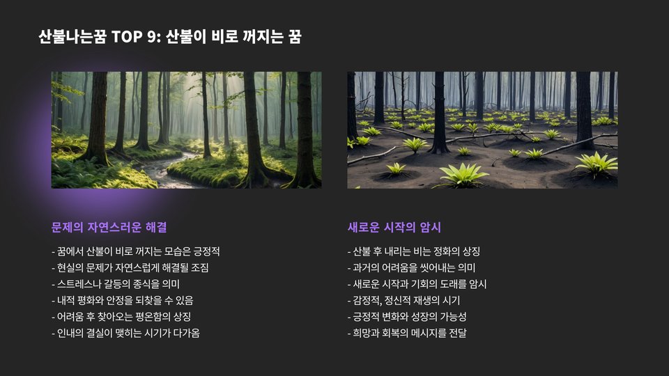 이와 같은 방식으로 계속해서 산불나는 꿈을 분석해 나갈 수 있습니다. 각 꿈에서 드러나는 메시지를 이해하고 삶에 적용하는 것이 중요합니다. 꿈을 통해 전달받는 메시지는 우리의 삶에 직접적인 영향을 줄 수 있으며, 이를 통해 더 나은 결정을 내릴 수 있습니다.