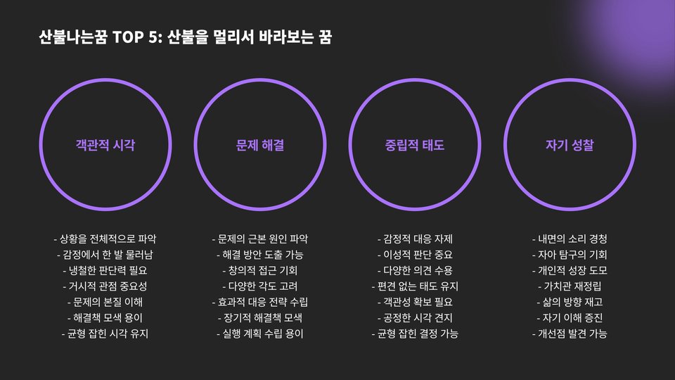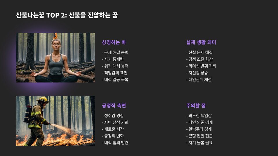 마지막으로, 꿈의 맥락과 개인의 상황에 따라 산불나는 꿈은 서로 다른 의미를 가질 수 있습니다. 꿈의 주인공이 누구인지, 그리고 그 꿈이 나타나는 순간의 감정이 무엇인지에 따라 해석은 다양합니다. 꿈의 배경, 즉 장소와 사람들도 중요한 요소입니다.