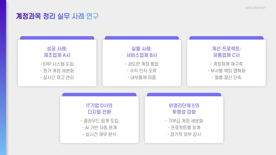 마지막으로, 규모가 큰 기업일수록 계정과목의 정리가 더욱 중요합니다. 규모가 커질수록 복잡한 거래가 많아지고, 그러한 거래를 올바르게 반영하기 위해서는 철저한 정리가 필수적입니다. 이런 정리는 내외부 이해관계자에게 미치는 영향이 크므로 반드시 신경 써야 합니다.
