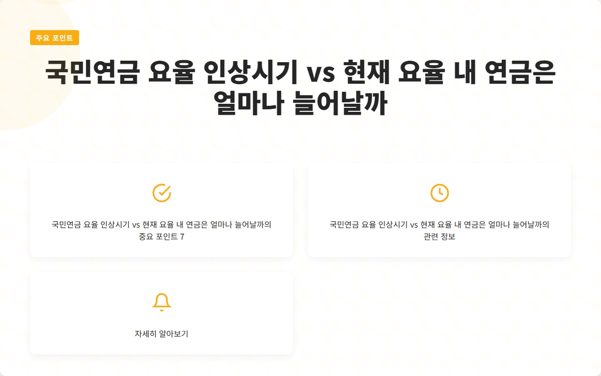 국민연금 요율 인상시기는 많은 이들의 관심사입니다. 현재 많은 사람들이 국민연금에 대한 불안과 우려를 가지고 있습니다. 하지만 이번 개혁안으로 인해 미래의 연금 수령액이 어떻게 변화할지 구체적으로 알 수 있습니다. 지금 확인해보세요!