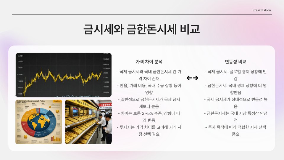 비교형 금시세는 특정 시점에서의 금 가격을 다른 시점이나 다른 형태의 금 가격과 비교하는 것입니다. 이러한 비교는 투자자들이 금의 가치를 평가하고, 현재 시장에서의 위치를 이해하는 데 도움을 줍니다. 예를 들어, 금시세가 상승할 때, 금한돈의 가격 비교를 통해 금을 구매하거나 판매할 시기를 결정할 수 있습니다.