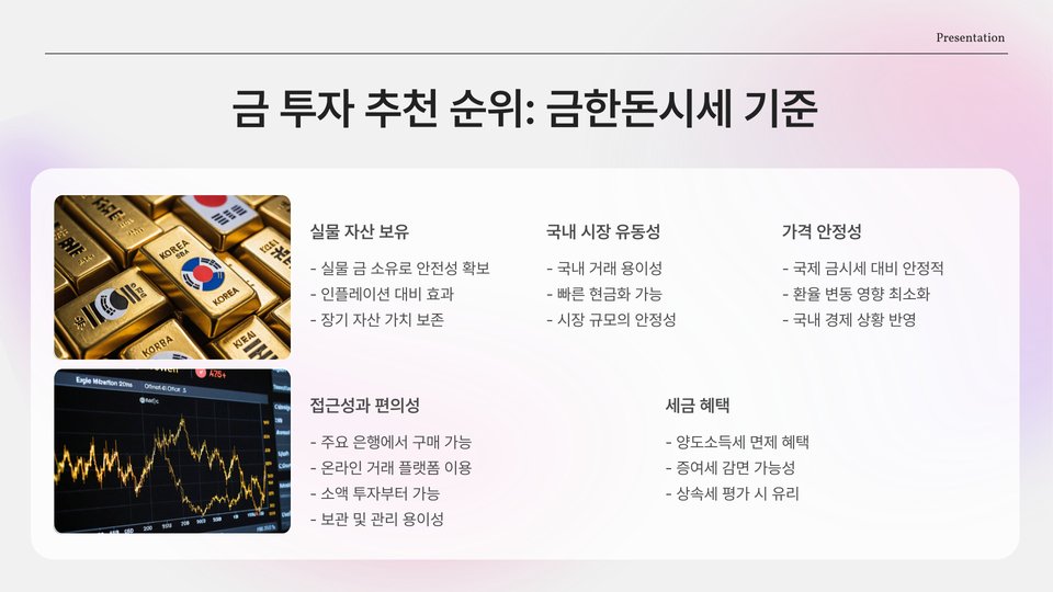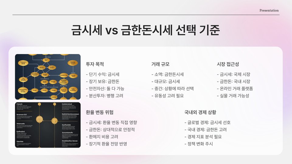 투자자가 금을 구매할 때는 비교형 금시세와 금한돈시세 모두를 고려해야 합니다. 다음은 선택 시 유용한 가이드입니다:
