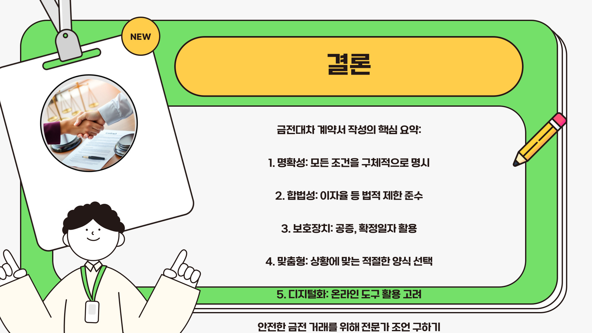 금전대차 계약서는 단순한 문서가 아닌, 모든 당사자의 권리와 의무를 명확하게 하는 중요한 도구입니다. 계약서를 정확하게 작성하고, 필요한 모든 조항을 포함하는 것이 매우 중요합니다. 이를 통해 불필요한 법적 분쟁을 예방하고, 대출 및 차용에 대한 신뢰를 구축할 수 있습니다. 따라서 계약서를 작성할 때는 항상 신중함을 기해야 합니다.