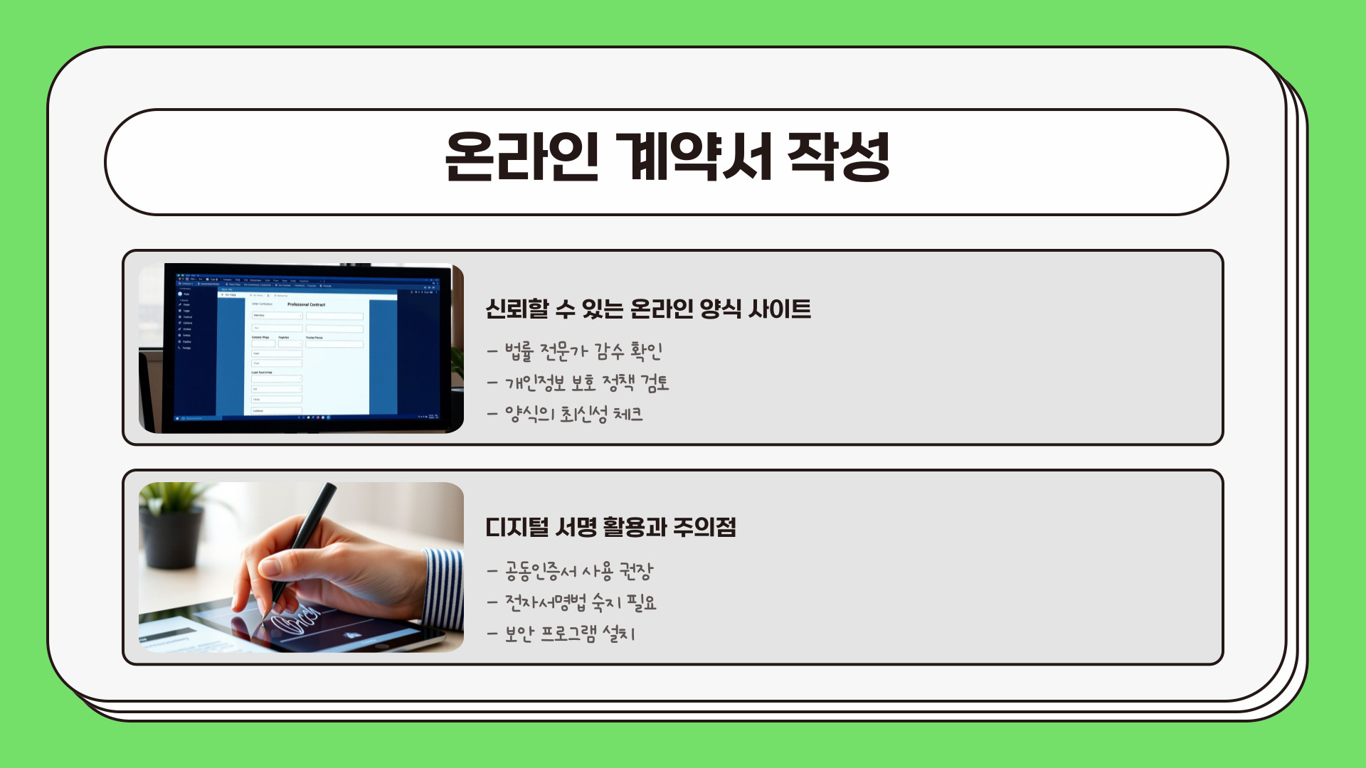셋째, 계약서에 대한 꼼꼼한 확인이 필요합니다. 입력한 정보가 정확한지 검토하는 시간을 갖고, 필요하다면 법률 전문가의 조언을 구하는 것도 좋습니다. 철저한 검토는 향후 발생할 수 있는 문제를 예방할 수 있는 가장 좋은 방법입니다.