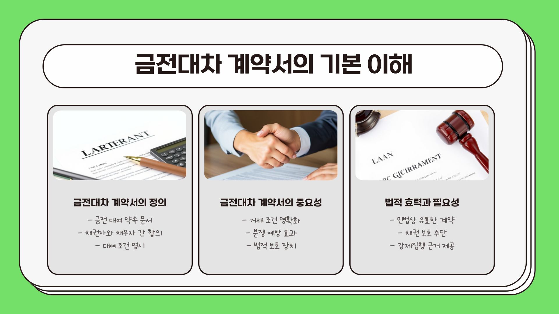 금전대차 계약서는 단순한 문서가 아닙니다. 이는 법적 효력을 가지며, 모든 당사자가 동의한 조건에 따라 금전 거래를 명확하게 정리합니다. 이러한 계약서를 통해 대출자는 자신의 자산을 보호할 수 있고, 차용자는 상환 의무를 명확히 하여 불필요한 갈등을 피할 수 있습니다. 특히, 계약서 미작성으로 인한 법적 분쟁을 예방할 수 있어 필수적입니다.