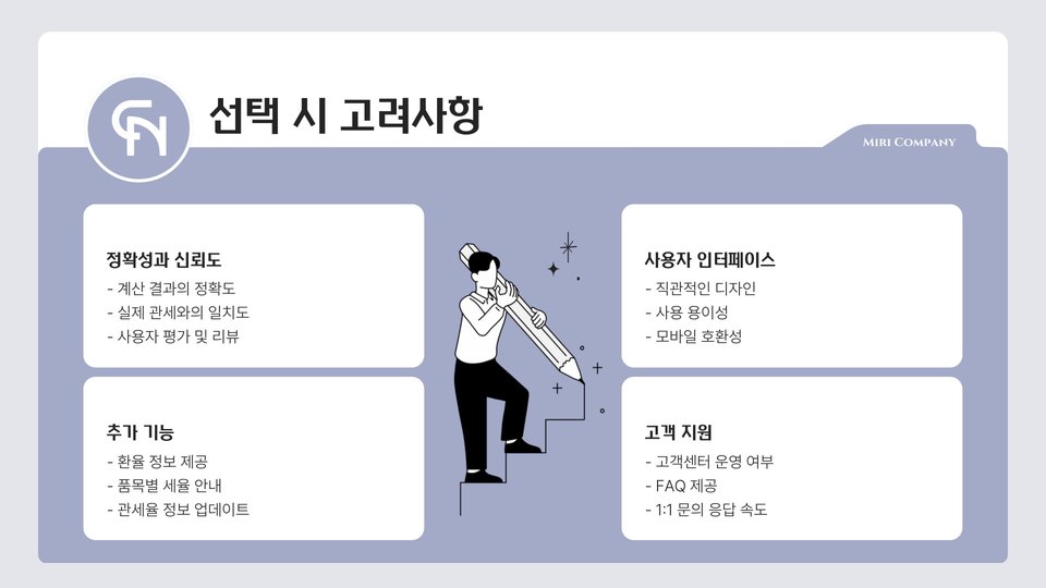 사용 편의성 역시 중요합니다. C사의 관세계산기는 복잡한 절차 없이 빠르게 계산할 수 있도록 설계되어 있어 많은 이들이 선호합니다. 반면에,D사는 다양한 기능을 제공하지만, 사용자가 맞춰서 다소 복잡하게 설정해야 할 수도 있어 초보자에게는 어려울 수 있습니다.