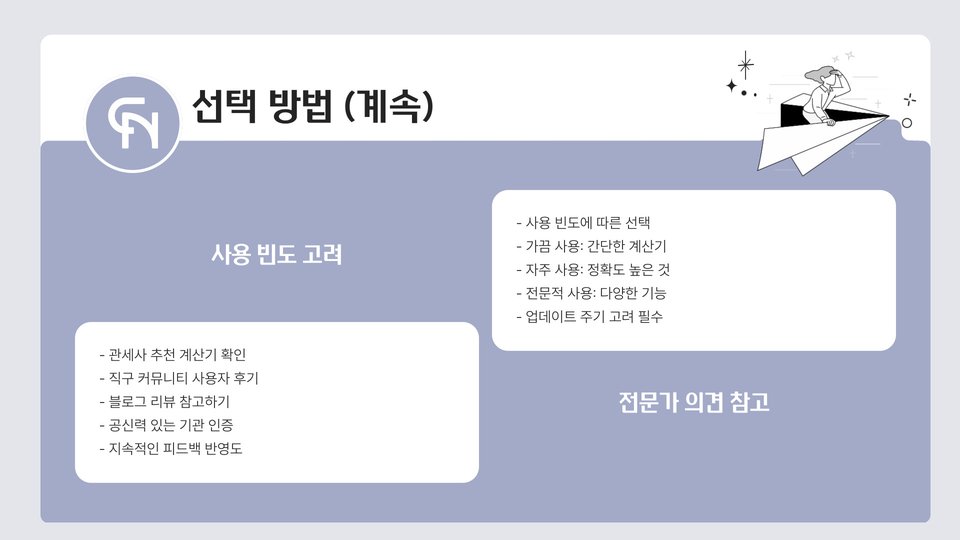 결국, 사용하고자 하는 목적에 맞춰 가격과 사용 편의성을 고려하면서 선택하는 것이 바람직합니다. 구체적인 사례로는, 저렴한 비용으로 기본적인 계산 및 분석 기능만 필요할 경우 무료 솔루션이 적절할 수 있으며, 복잡한 세금 문제를 다루는 업종에서는 유료 솔루션이 장기적으로 비용 효율적일 수 있습니다.