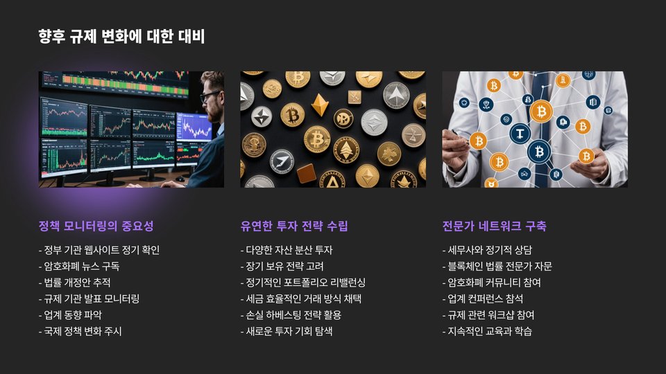 마지막으로, 장기 투자를 고려하는 전략이 있습니다. 장기 자산 보유는 장기 자본 이득세를 적용받기 때문에 세금 부담을 줄일 수 있습니다. 이는 특히 암호화폐의 장기적인 성장 가능성을 고려할 때 유용한 접근 방식이 될 수 있습니다.
