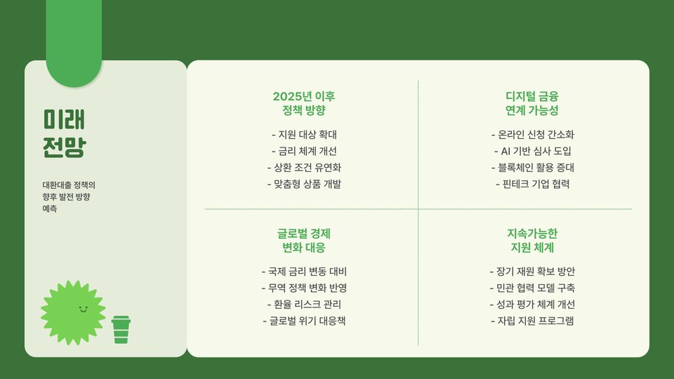 마지막으로, 대환대출을 통해 장기적으로 안정적인 경영 기반을 마련하는 것이 중요합니다. 대환대출이 주는 단기적 유동성 뿐만 아니라, 향후의 성장 가능성을 함께 고려하는 것이 필요합니다. 올바른 선택으로 새로운 기회를 창출하길 바랍니다!