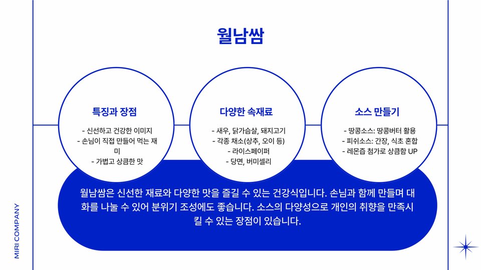 불고기 요리는 간단하면서도 화려한 프레젠테이션이 가능합니다. 직접 테이블에서 구워서 먹는 것도 인기 있는 방법입니다. 이렇게 해서 손님들과의 대화 속에서 요리를 즐기는 경험은 더욱 특별해집니다. 뷔페 스타일로 여러 가지 야채와 단백질을 선택할 수 있게 구성하면, 더욱 자유로운 선택을 제공합니다.