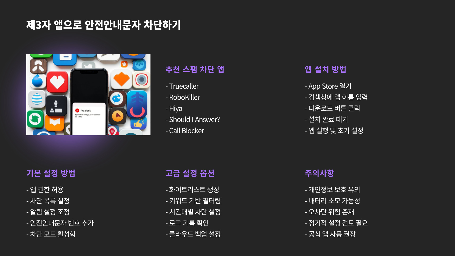 마지막 방법은 스팸 차단 앱을 사용하는 것입니다. 앱 스토어에는 다양한 스팸 차단용 애플리케이션이 제공되고 있습니다. 이러한 앱은 수많은 사용자 데이터를 기반으로 스팸 문자 및 전화를 차단해줍니다. 사용자는 자주 수신하는 번호와 메시지를 설정하여, 보다 효과적으로 스팸으로부터 보호받을 수 있습니다.
