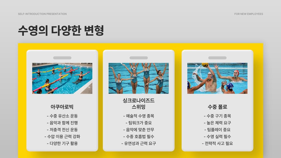 - 자유형, 배영, 평영, 접영 등 다양한 스타일 존재
