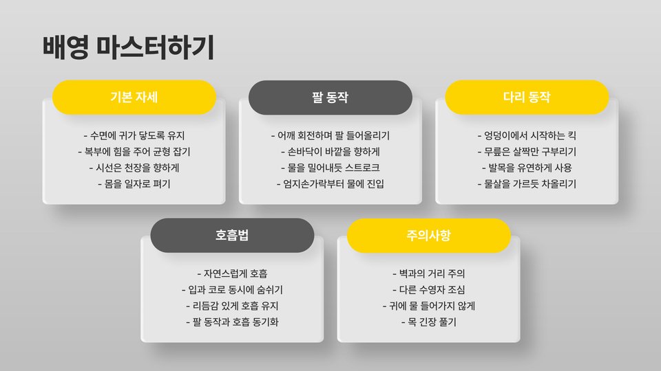자신만의 수영 스타일을 찾고, 지속적으로 연습하면서 당신의 수영 실력을 한 단계 업그레이드해 보세요!