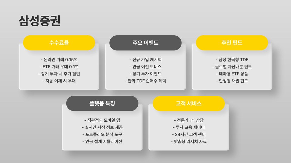 삼성증권은 안정성과 신뢰성을 바탕으로 많은 투자자들에게 사랑받고 있습니다. 특히 가장 추천되는 연금저축펀드 중 하나로 알려져 있습니다. 삼성증권의 연금저축펀드는 다양한 자산에 투자할 수 있는 옵션을 제공하며, 수수료가 경쟁력 있는 수준으로 설정되어 있어 장기 투자에서 유리합니다.