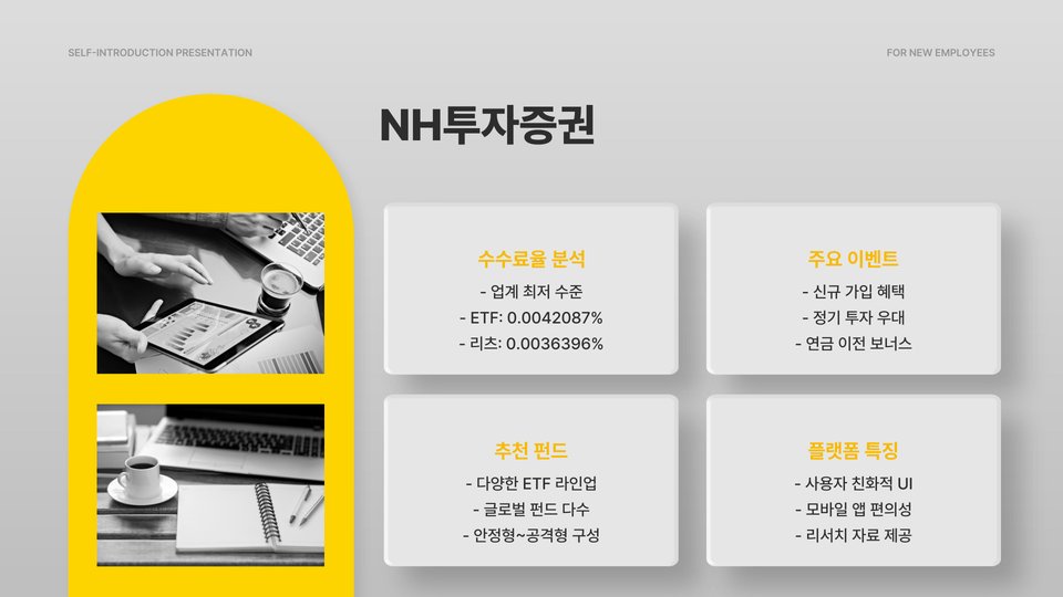 투자자들을 위한 다양한 혜택을 제공하며, 특히 장기적으로 지속 가능한 투자 수익률을 목표로 하고 있습니다. NH투자증권의 투자 전략은 글로벌 경제 전망을 바탕으로 하며, 실질적인 수익률 개선을 위해 다양한 애널리스트들의 의견을 반영합니다. 이외에도 고객 서비스와 맞춤형 상담을 통해 개인적인 투자 목표에 따른 맞춤형 전략을 제안합니다.