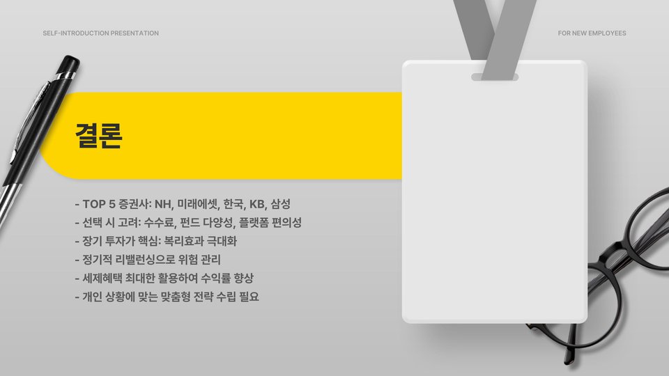 이번 포스팅에서는 연금저축펀드를 제공하는 증권사 TOP 5를 소개했습니다. 각 증권사는 저마다의 특징과 강점을 가지고 있어 투자자의 필요에 맞는 선택이 중요합니다. 투자자는 각 증권사의 혜택과 상품을 비교하여 반드시 자신에게 맞는 최적의 연금저축펀드를 선택해야 합니다. 효과적인 투자와 안정적인 노후 준비를 위해 연금저축펀드의 활용을 적극 권장드립니다.