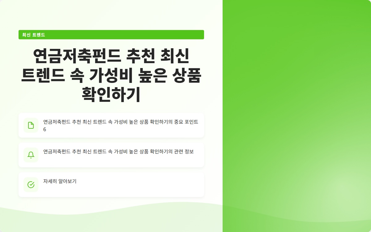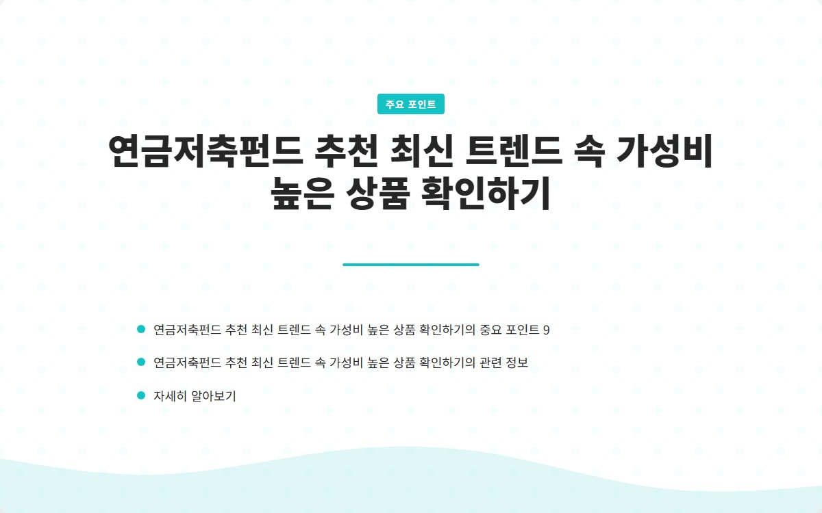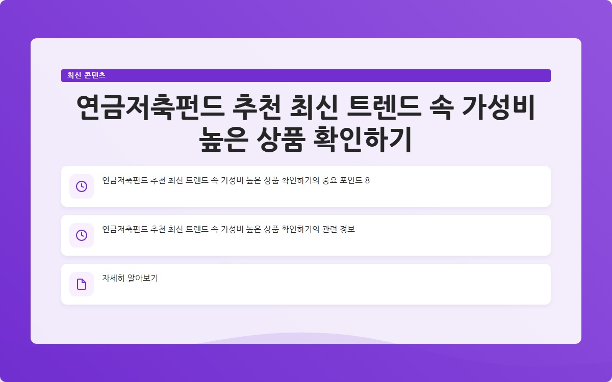 연금저축펀드는 노후 준비를 위한 필수적인 금융 상품입니다. 최신 트렌드를 반영하여 ESG 투자 상품을 고려하는 것도 좋은 선택입니다. 가성비 높은 상품을 찾고 있다면, 수수료와 수익률을 반드시 비교하고 자신의 투자 성향에 맞는 상품을 선택해야 합니다. 노후를 위한 준비는 지금 시작하는 것이 가장 현명합니다.