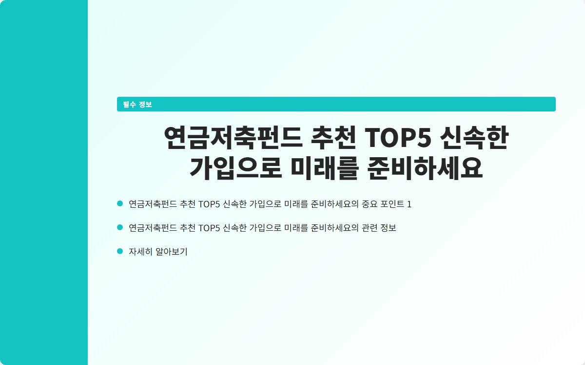 연금저축펀드는 노후 준비를 위한 필수적인 투자 수단입니다. 연금저축펀드 추천 TOP5를 통해 자신에게 맞는 상품을 선택하고, 신속하게 가입하여 안정적인 미래를 준비하세요. 장기적인 시각으로 투자하며, 자신의 투자 성향에 맞는 펀드를 선택하는 것이 중요합니다.