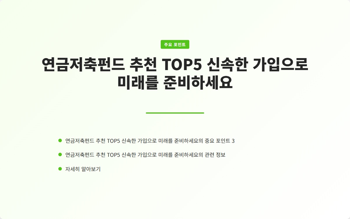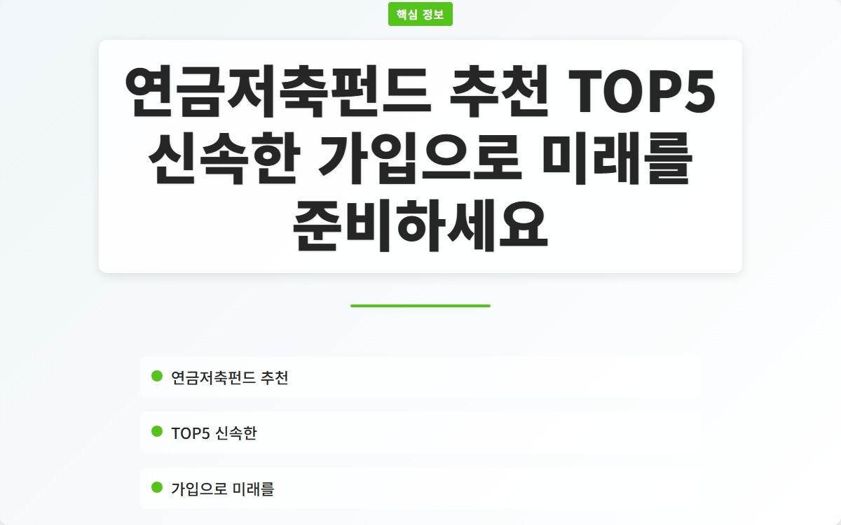이제 본격적으로 연금저축펀드 추천 TOP5를 살펴보겠습니다. 각 펀드는 고유의 특징과 장점을 가지고 있으니, 자신에게 맞는 상품을 선택하는 것이 중요합니다.