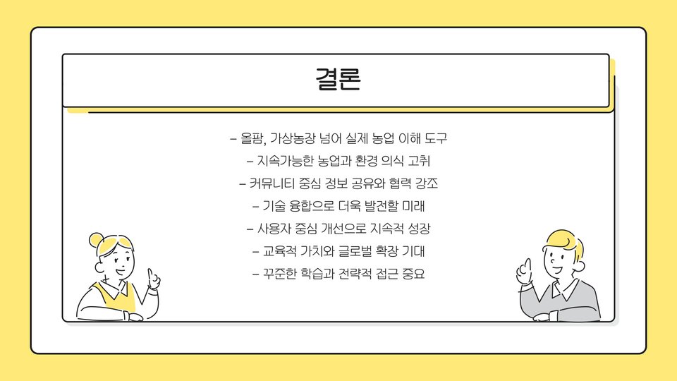 올팜 맞팜의 가장 큰 장점 중 하나는 사용자 친화적인 인터페이스입니다. 농민들이 쉽게 접근할 수 있도록 설계되어 있으며, 복잡한 데이터도 시각적으로 이해하기 쉽게 제공됩니다. 이로 인해 농민들은 쉽고 빠르게 필요한 정보를 얻을 수 있습니다. 또한, 다양한 교육 자료와 커뮤니티 지원을 통해 초보 농민들도 쉽게 적응할 수 있습니다.