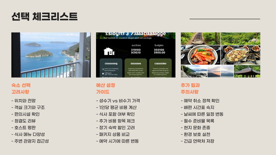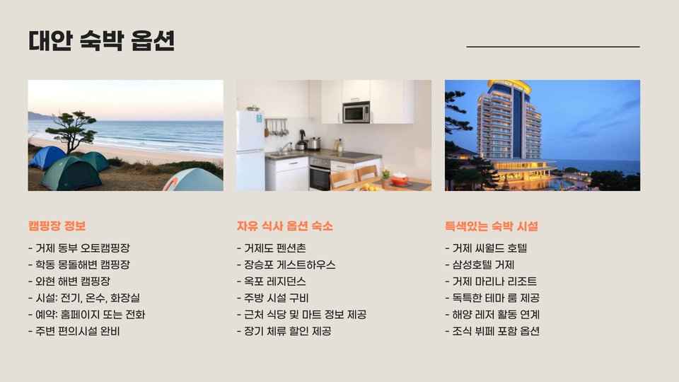 두 번째로는 숙소의 위치입니다. 이수도는 아름다운 자연경관을 자랑하는 만큼 숙소에서의 전망이나 접근성이 중요합니다. 해변 근처나 주요 관광지와 가까운 위치에 있는 숙소라면 더 좋은 경험이 될 수 있습니다.