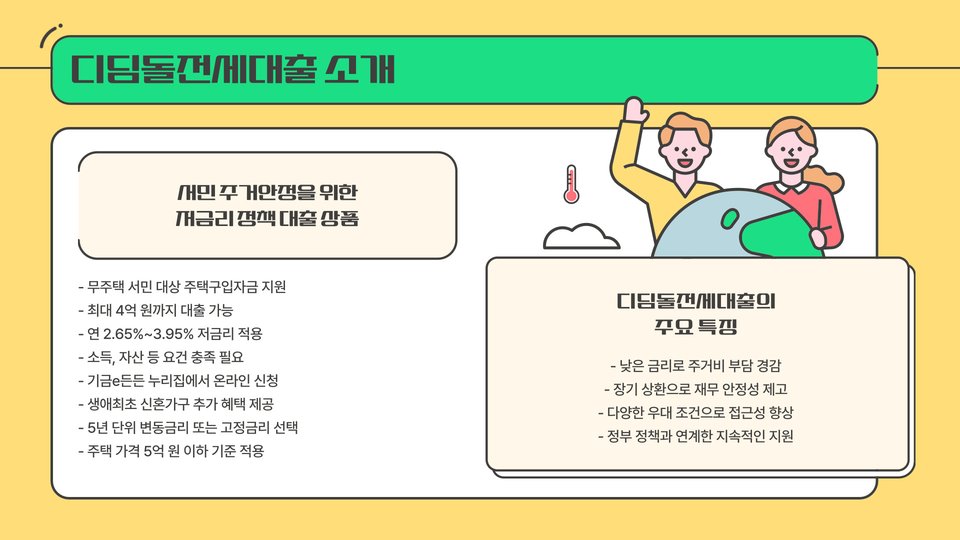 - 디딤돌전세대출은 첫 주택 구매자에게 유리한 고정금리를 제공합니다.