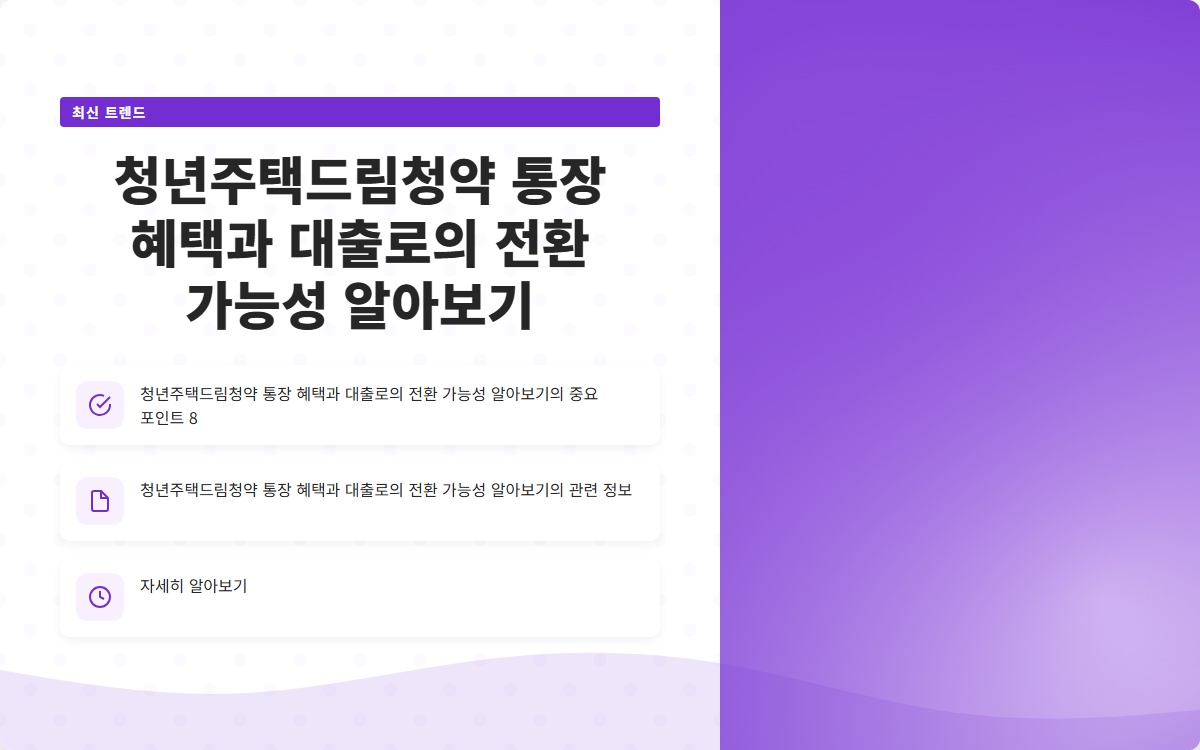 청약통장은 단순한 저축 통장이 아닌, 향후 대출로의 전환이 가능합니다. 주택 구매 시 청약 통장을 활용하여 대출을 신청할 수 있으며, 이는 청년들이 주택을 구매하는 데 필요한 자금을 마련하는 데 유리한 조건을 제공합니다. 특히, 청약통장을 통해 청약에 성공한 후 대출로 전환하면, 금리 우대 혜택을 받을 수 있는 경우도 많아 경제적 부담을 줄일 수 있습니다.