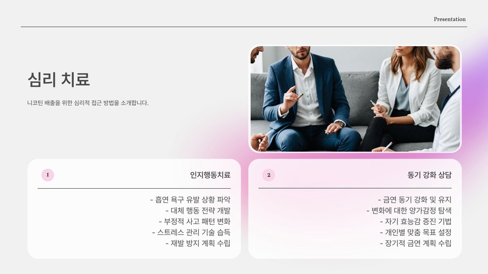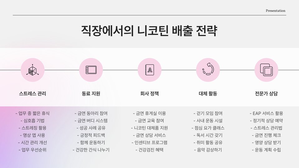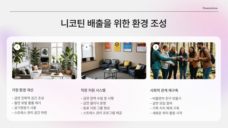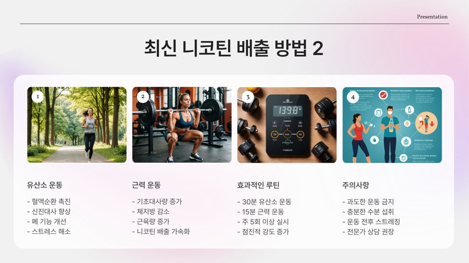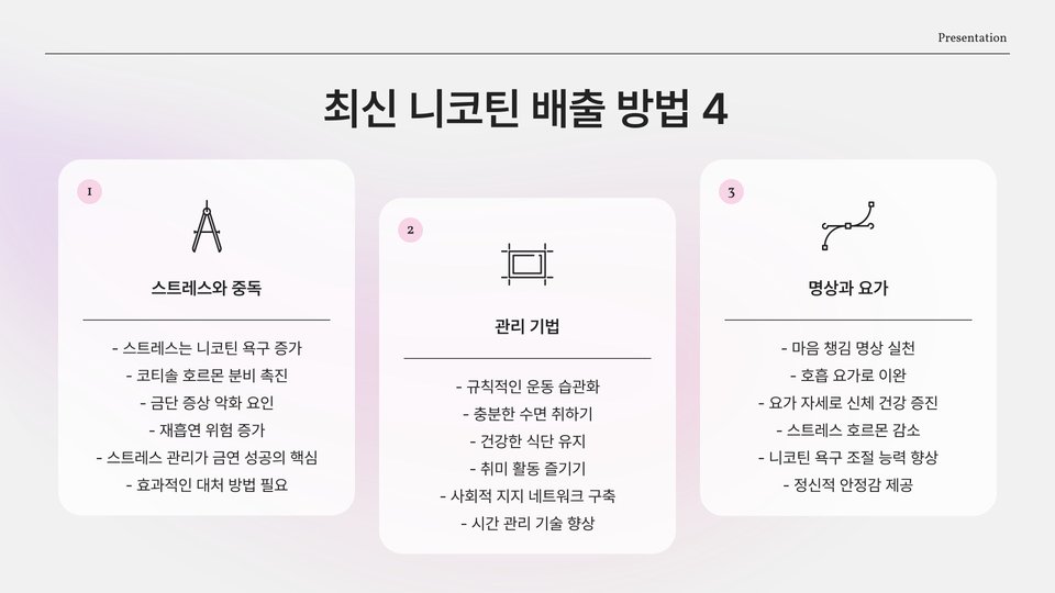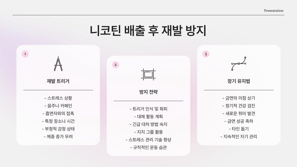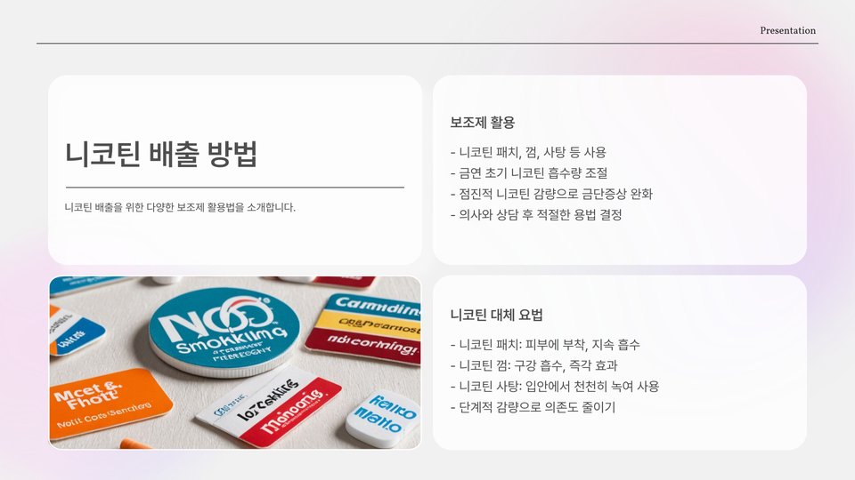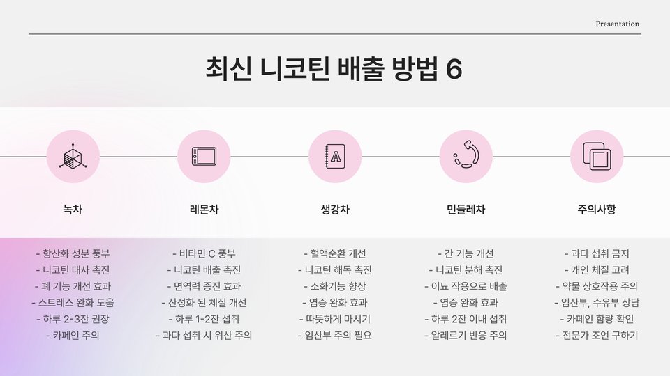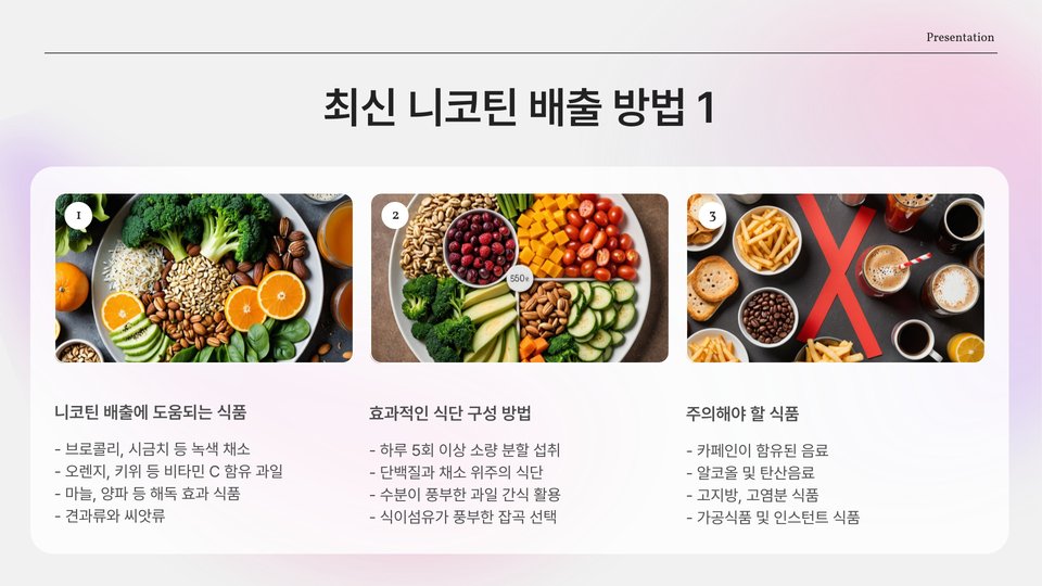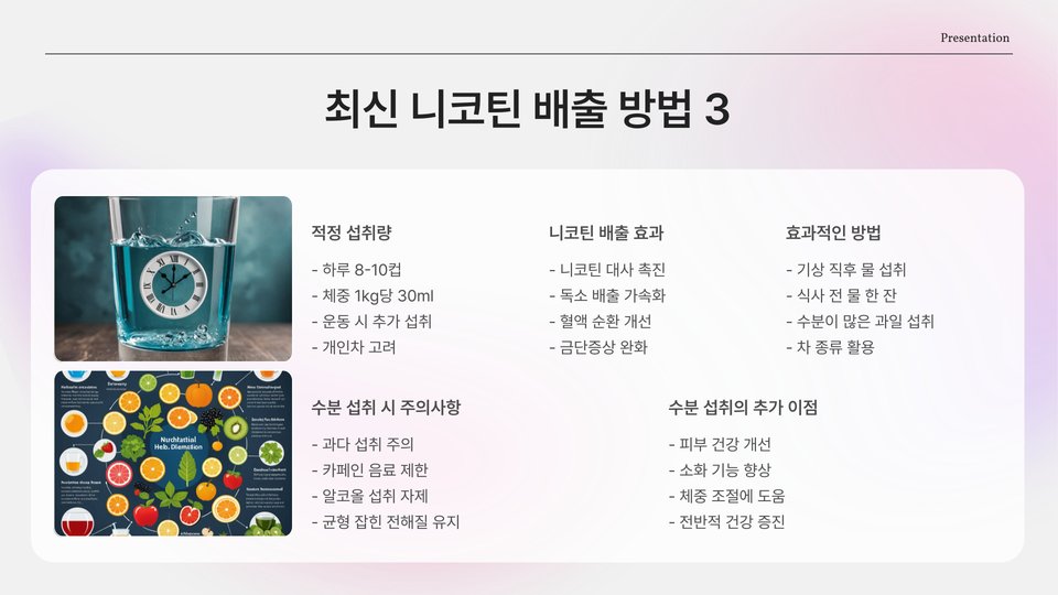 - 물 많이 마시기, 운동하기, 건강한 식사 등을 통해 니코틴을 배출할 수 있습니다.