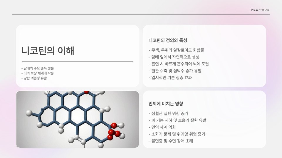- 니코틴은 중독성이 강한 물질로 건강에 큰 위험을 초래합니다.