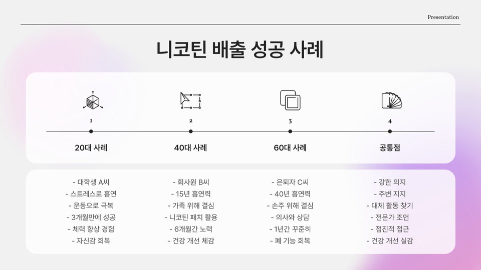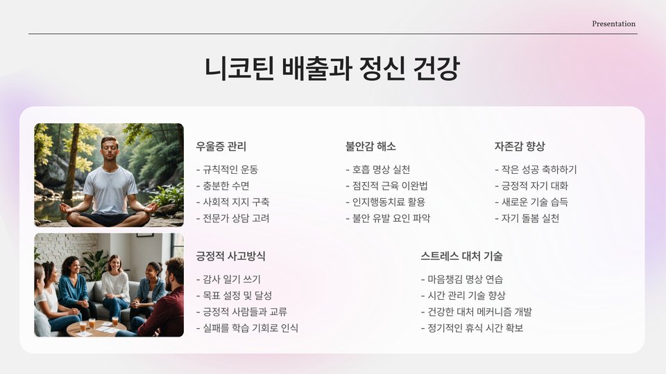 셋째, 정신적으로도 더 나은 상태를 유지할 수 있습니다. 니코틴 배출 후 불안과 스트레스가 줄어들며, 집중력 또한 향상됩니다. 이 모든 변화들은 건강한 라이프스타일로의 첫걸음을 내딛게 만듭니다.