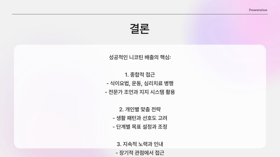 니코틴 배출은 단순한 금연의 과정이 아니라, 건강한 삶을 위한 필수적인 단계입니다. 건강한 생활습관을 유지하며 니코틴을 효과적으로 배출하면, 심장과 폐 건강을 개선하고, 전반적인 웰빙을 증진할 수 있습니다. 따라서 니코틴 배출을 위한 다양한 방법을 시도하고, 이를 일상 속에서 실천하는 것이 중요합니다.