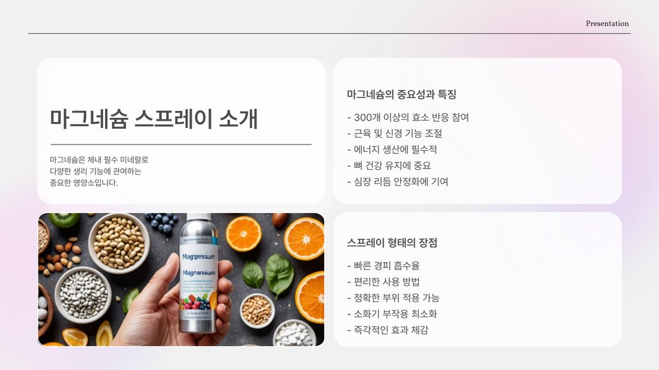 마그네슘은 우리 몸에 꼭 필요한 필수 미네랄로, 근육 기능과 신경 전도 등 여러 생리적 기능에 중요한 역할을 합니다. 최근에는 마그네슘을 피부에 직접 흡수할 수 있는 형태인 마그네슘 스프레이가 주목받고 있습니다. 이러한 스프레이는 구강 섭취와는 다른 방식으로 빠르게 효과를 볼 수 있다는 점에서 많은 관심을 끌고 있습니다. 특히 운동 후 회복을 원하거나 스트레스를 줄이고자 하는 사람들에게 유용한 선택이 될 수 있습니다.