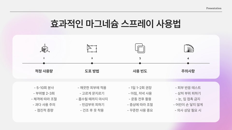 마그네슘 스프레이를 효과적으로 사용하기 위해서는 몇 가지 중요한 포인트를 알아야 합니다. 첫째로, 스프레이를 사용할 부위를 깨끗하게 세척해야 합니다. 이는 마그네슘이 피부를 통해 효과적으로 흡수될 수 있도록 도와줍니다. 일반적으로는 근육 통증이나 긴장이 느껴지는 부위에 직접 뿌리는 것이 좋습니다. 예를 들어, 허리 통증이 있는 경우 허리에 직접 뿌리는 것이 효과적입니다.