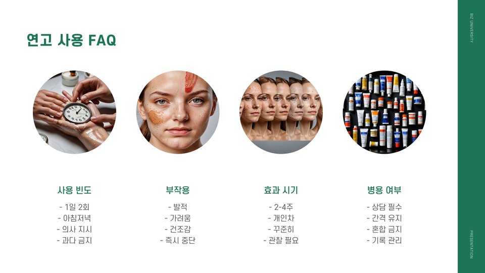 연고를 사용할 때는 몇 가지 유의사항을 따라야 합니다. 첫째, 연고를 바르기 전에는 반드시 해당 부위를 깨끗이 씻고 건조시켜야 합니다. 둘째, 연고는 정해진 용량과 주기에 맞춰 사용해야 하며, 과다 사용하지 않도록 주의해야 합니다. 셋째, 사용 중 피부에 이상이 생길 경우 즉시 사용을 중지하고 전문의와 상담하는 것이 중요합니다.