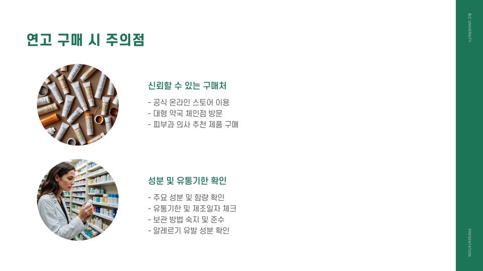 우선, 연고의 성분을 더욱 세밀하게 살펴보는 것이 중요합니다. 일부 연고는 화학 성분이 포함되어 있어 부작용이 발생할 수 있습니다. 따라서 리서치를 통해 사용자 리뷰를 참고하고, 제품의 안전성을 검증하는 것이 좋습니다. 믿을 수 있는 브랜드에서 제품을 선택하는 것이 보다 안전합니다.