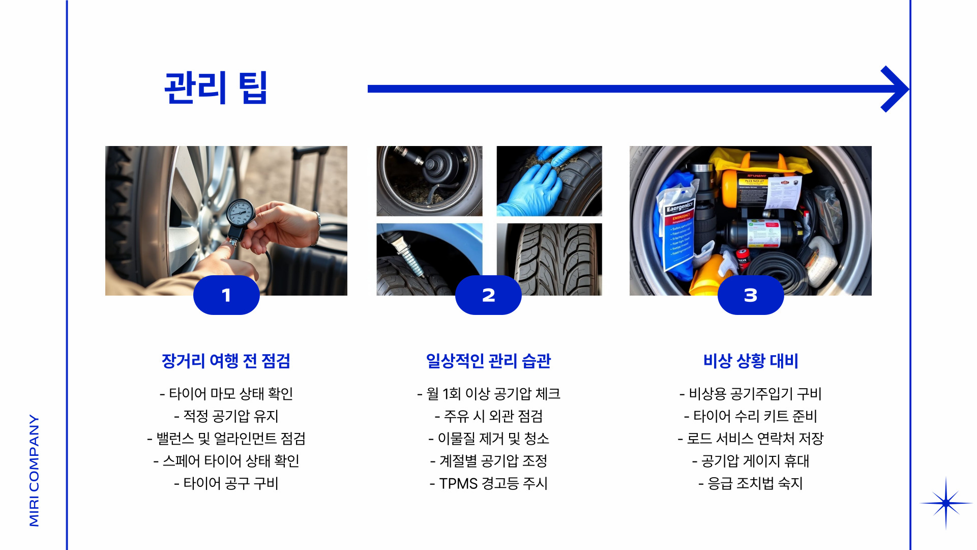 또한, 장거리 운전 시 목적지에 도착하기 전에 반드시 타이어 공기압을 점검하는 습관을 기르는 것도 중요합니다. 주유소에 가면 공기압을 무료로 점검해주는 서비스가 많습니다. 이를 잘 활용하여 공기압을 체크하세요.