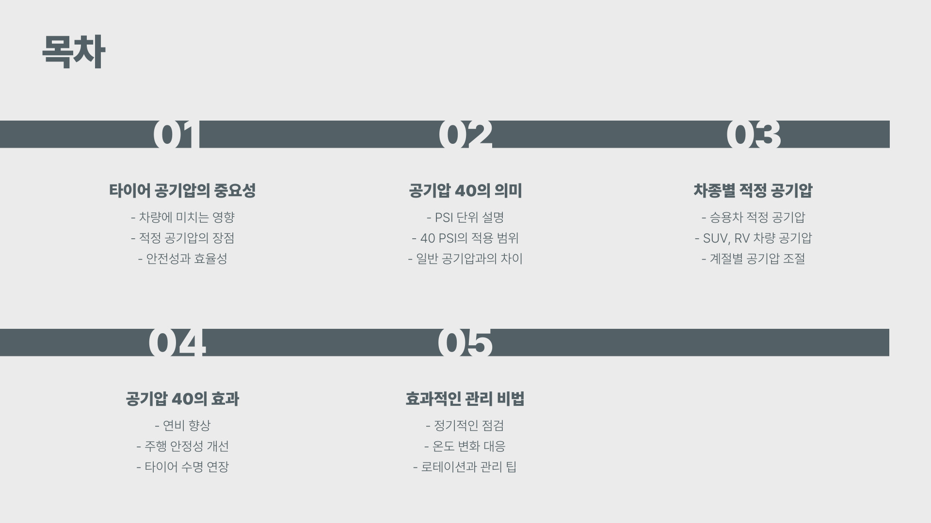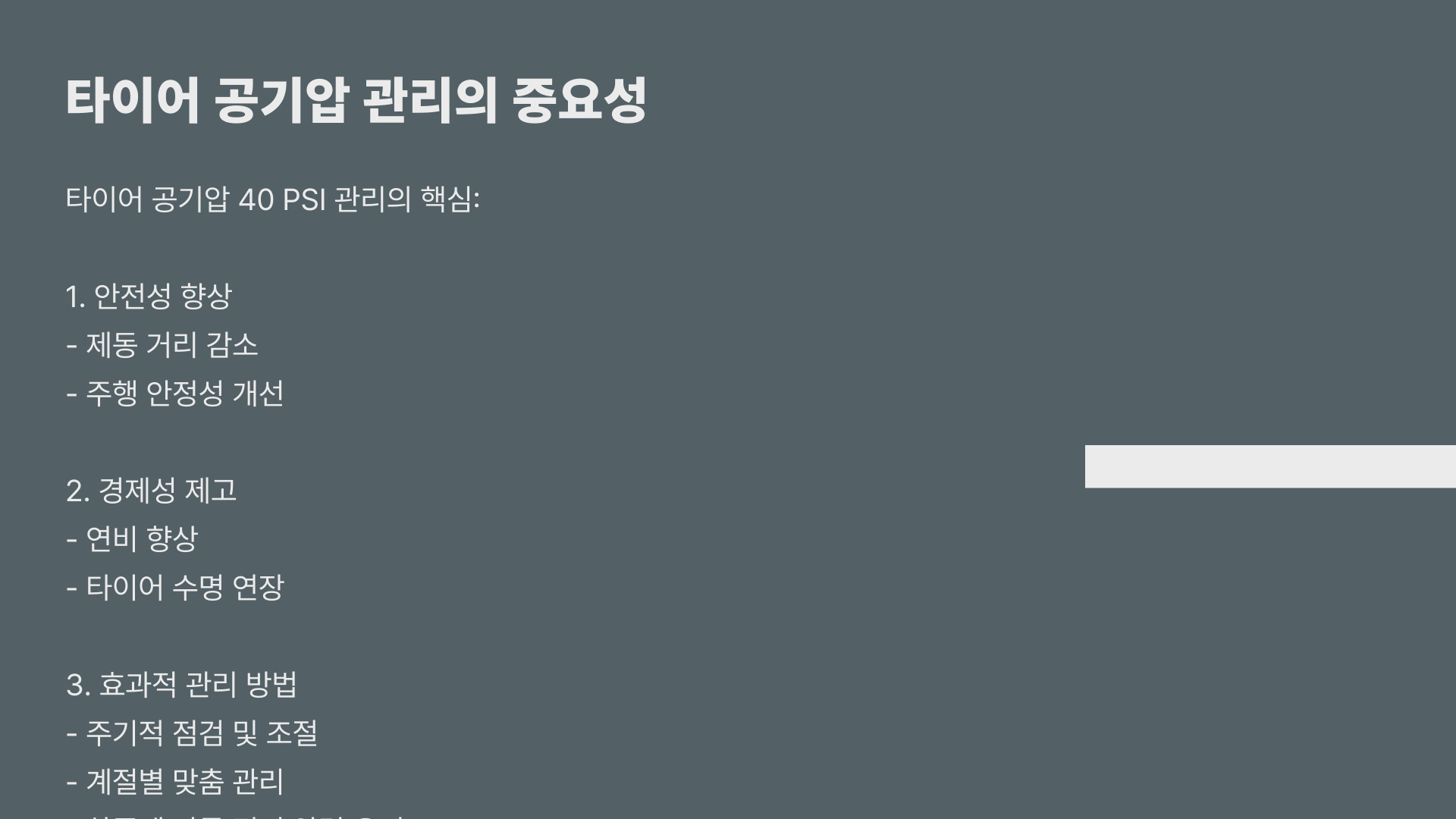 타이어 공기압을 40psi로 유지하는 것은 안전하고 효율적인 운전의 핵심입니다. 정기적인 점검과 적절한 관리로 연비를 향상시키고 타이어 수명을 늘릴 수 있습니다. 운전자는 이러한 정보를 바탕으로 더욱 안전한 주행을 위해 노력해야 합니다. 항상 타이어 공기압을 체크하고, 필요 시 조정하여 최상의 주행 성능을 유지하세요.