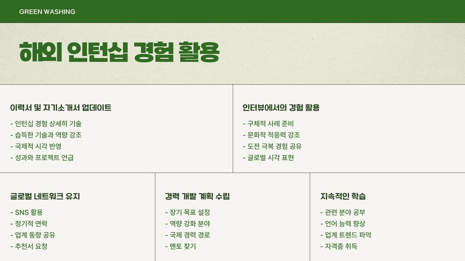 또한, 인턴십 종료 후에도 관계를 유지하며, 향후 추천서나 조언을 받을 수 있는 기회를 만들어 보세요. 이러한 네트워크는 경력 발전에 큰 자산이 될 것입니다.
